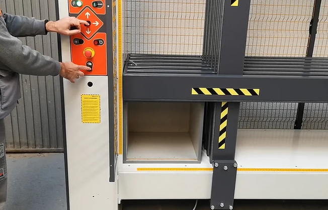 Automatic transfer Station ATS-2670 is an element that is located behind the press allowing the cabinets to be unloaded and inserted into transport lines. Equipped with PVC-coated driven rollers and polyurethane cross-belts. 410mm conveyor height